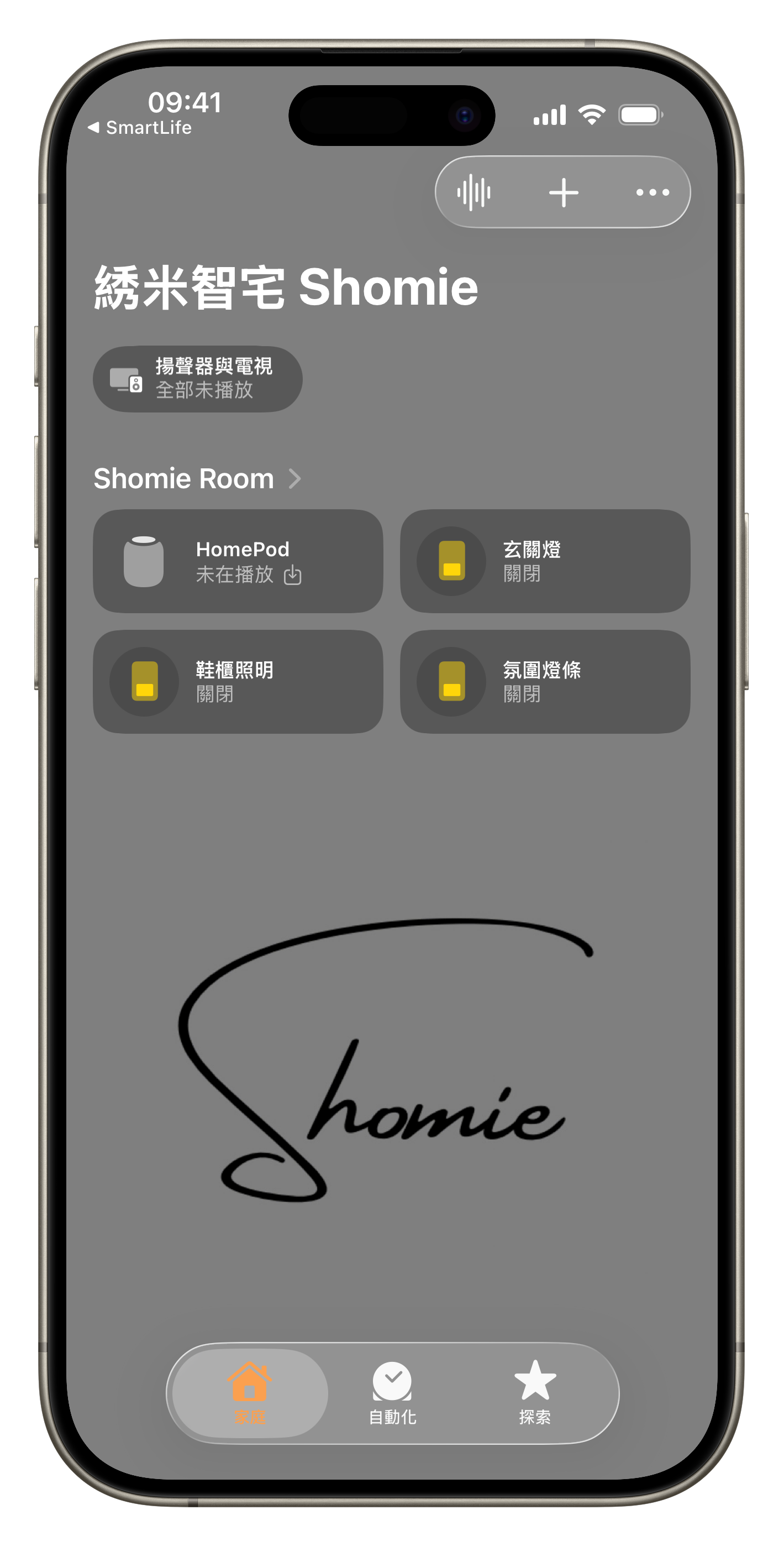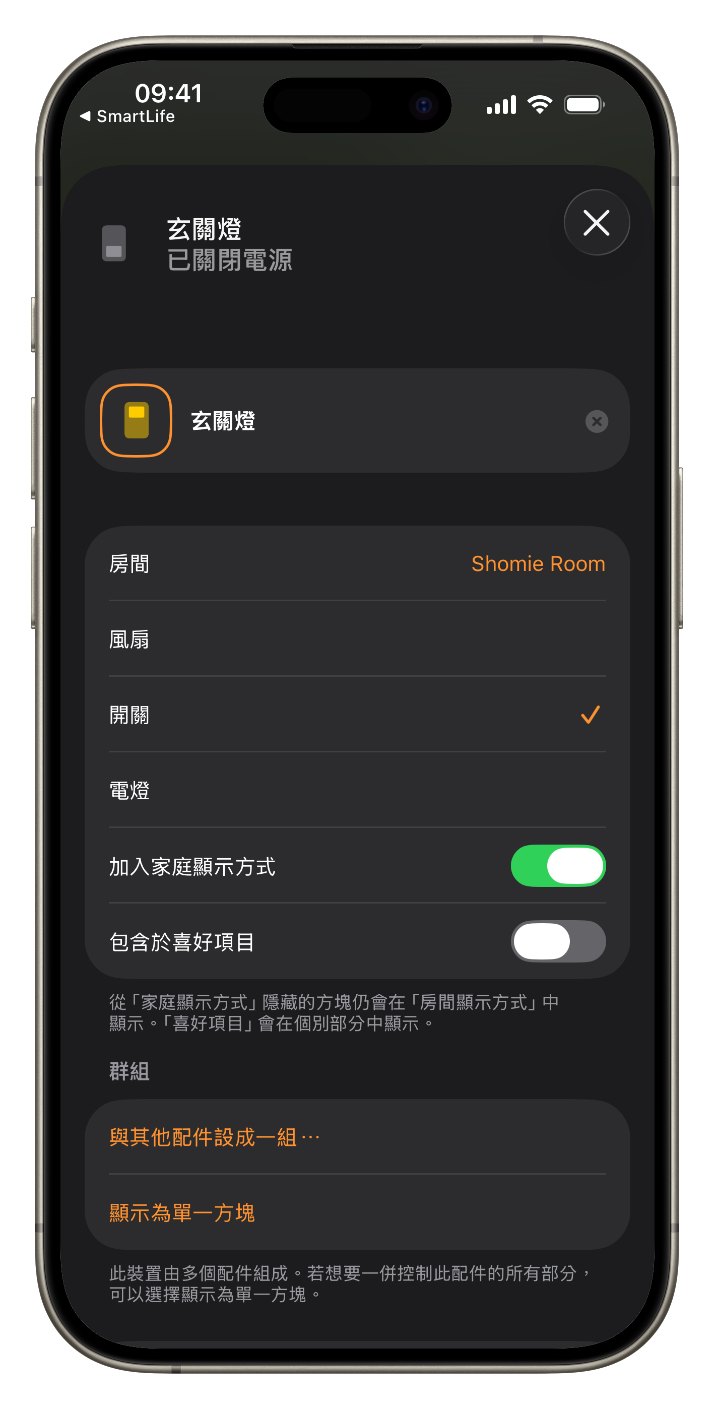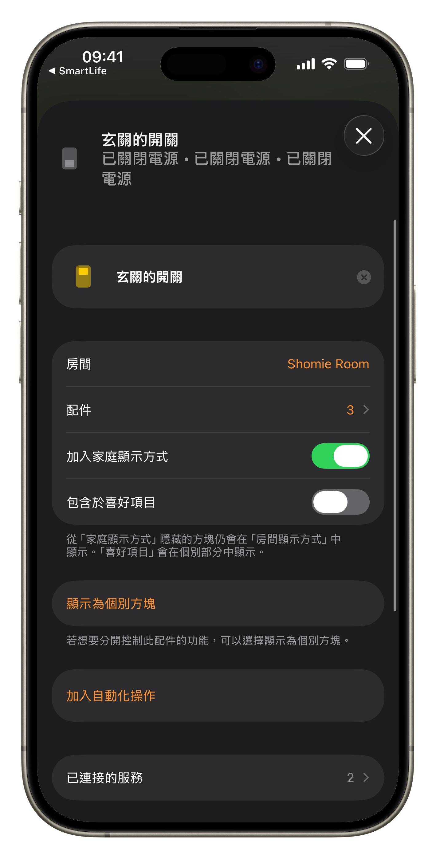 兩個按鍵以上的智慧開關,剛加入至「Apple 家庭」之初會顯示為單一方塊。為了更方便的直接控制每一個按鍵,我們可以將開關獨立「顯示為個別方塊」。